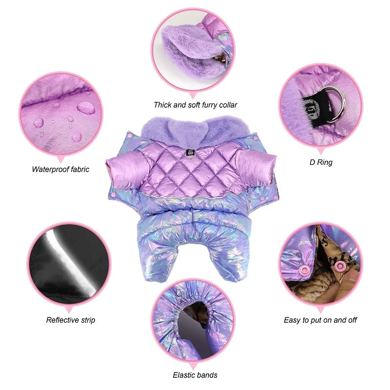 Our FurThermal™ Snowsuit is designed for warmth, comfort, and style. Crafted from high-quality, waterproof material, it ensures your pet stays dry even in the heaviest snow or rain. The lightweight design means absolute freedom of movement, letting your dog play and run with ease. Perfectly tailored for small and medium breeds, including chihuahuas and pugs, this snowsuit also fits adventurous cats. With a plush fur collar, it provides additional warmth and a touch of luxury, making it a must-have for winter outings.